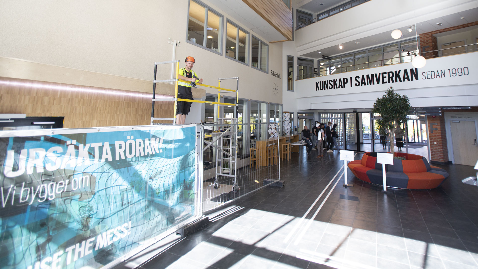 Nu har vi kommit några månader in i etapp 2 av ombyggnationen av Högskolan väst och vår hantverkare syns högt och lågt i byggnaden.